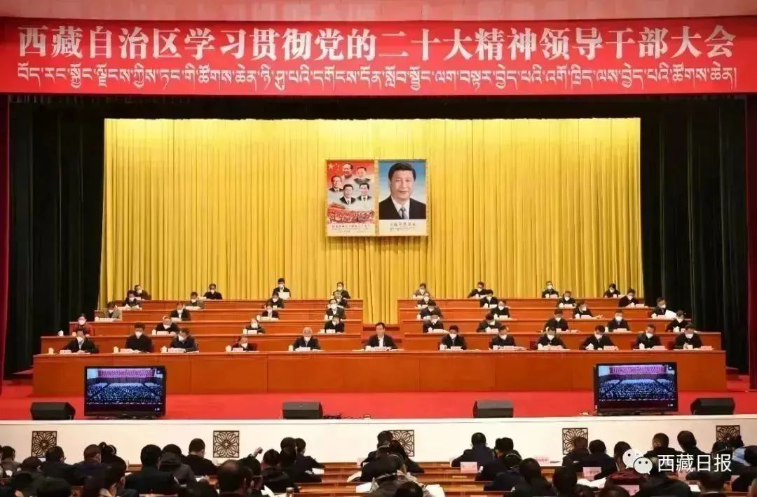 10月26日上午,自治区召开领导干部大会,传达学习贯彻党的二十大精神。自治区党委书记王君正主持并讲话。强调,学习宣传贯彻落实党的二十大精神是当前和今后一个时期全区各级各部门和广大党员干部的首要政治任务。要认真学习宣传贯彻落实党的二十大精神,紧密联系党的百年奋斗历程特别是党的十八大以来新时代十年的伟大变革,深刻领悟“两个确立”的决定性意义,增强“四个意识”、坚定“四个自信”、做到“两个维护”,深入学习领会党的二十大报告的重要思想、重要观点、重大战略、重大举措,切实把思想和行动统一到党的二十大精神上来,统一到党中央决策部署上来,努力开创西藏长治久安和高质量发展新局面,推动党的二十大擘画的宏伟蓝图、作出的决策部署在西藏落地见效。