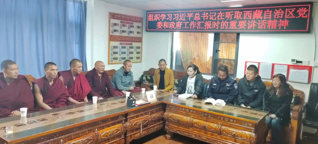 会议传达学习习近平总书记在听取西藏自治区党委和政府工作汇报时的重要讲话精神,全面阐述西藏自治区成立60年以来的发展成就,深入浅出地讲解新时代党的治藏方略和利寺惠僧政策,用身边生动鲜活的事例向寺庙僧人深刻阐释了寺庙基础设施不断完善、僧人生活水平显著提高,让广大寺庙僧人深刻感受到党的温暖和关怀,继承和发扬爱国爱教的优良传统,始终做到与党同心同德、同向同行,努力在引导藏传佛教与社会主义社会相适应中作贡献。同时,以9月民族团结进步宣传活动月为契机开展新修订《西藏自治区民族团结进步模范区创建条例》和相关法律法规政策宣讲活动。通过学习宣讲,寺庙僧人对铸牢中华民族共同体意识的重要性和重大意义有了更深入地理解。(多吉次旺)