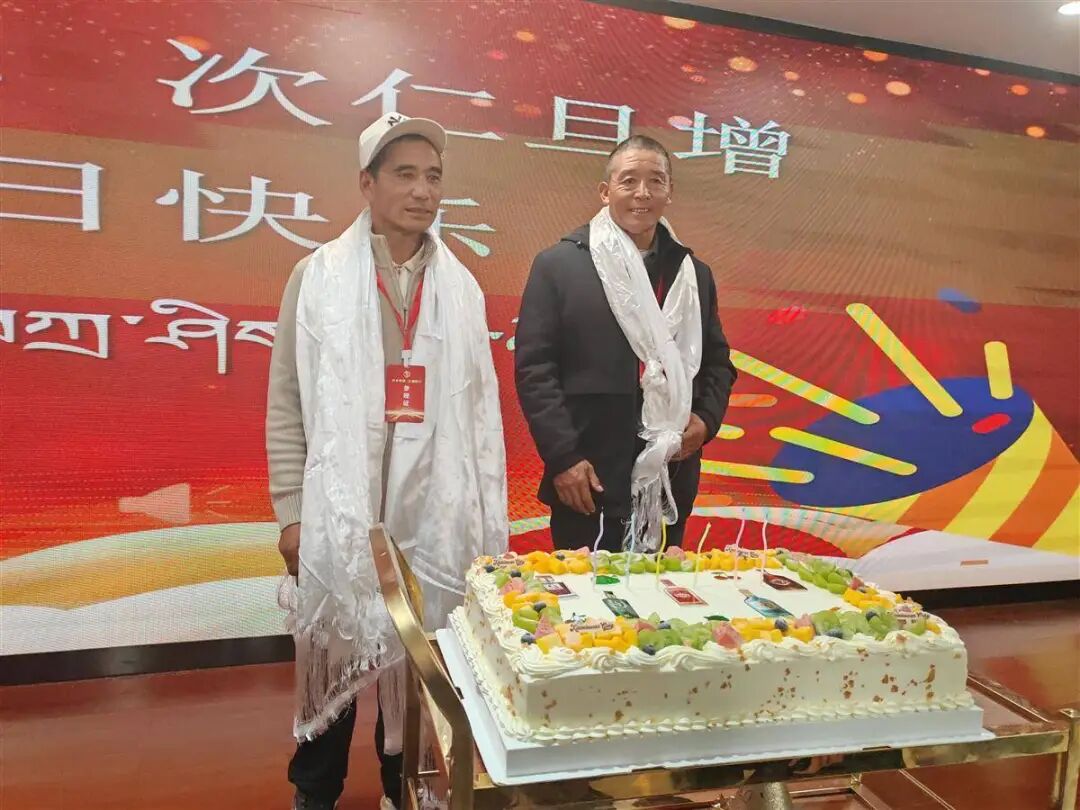 图为劲牌公司给远道而来的两位藏族家长过生日。