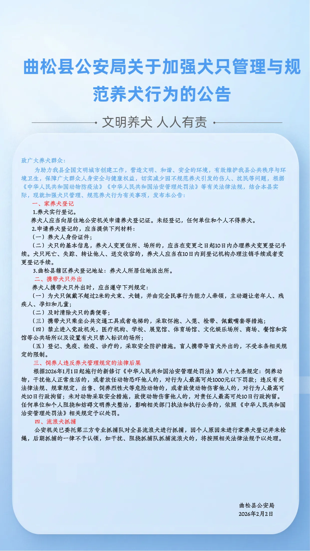 曲松县公安局关于犬只管理与规范养犬行为的公告